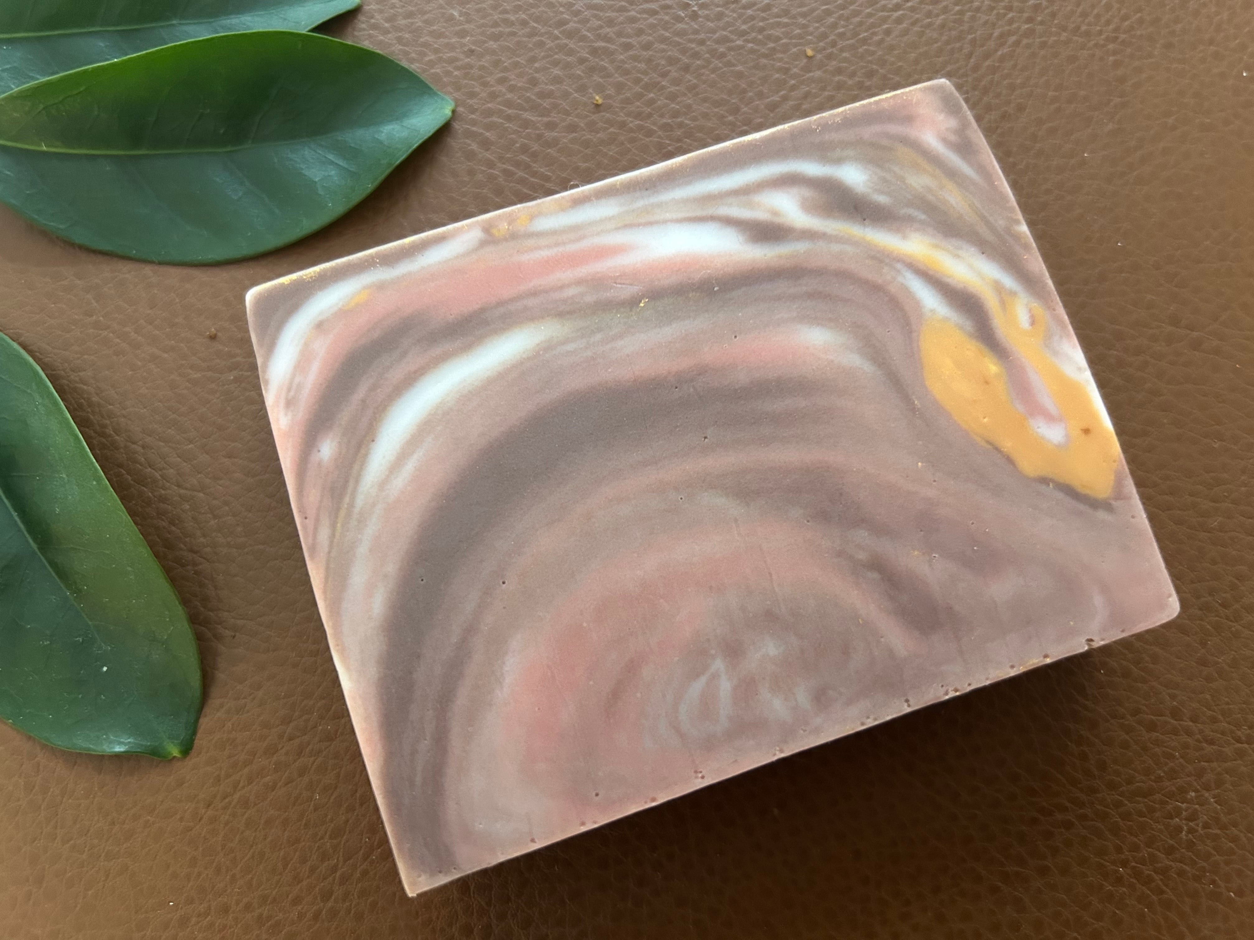 En lækker, håndlavet Swirl-sæbe med en skøn duft af lette krydderier, cedertræ, vaniljetonka, kokosnød, jasmin, oliventræ, sandeltræ, rav, moskus og kakaosmør. .