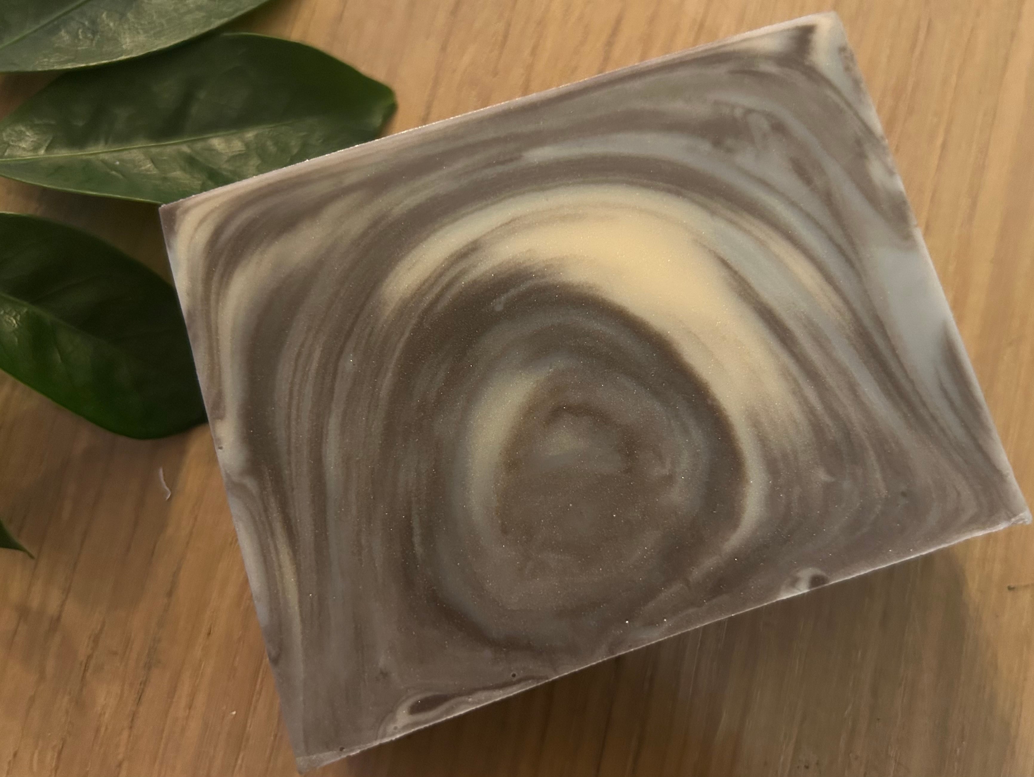 En håndlavet Swirl-sæbe med en skøn duft af lette krydderier, cedertræ, vaniljetonka, kokosnød, jasmin, oliventræ, sandeltræ, rav, moskus og kakaosmør.