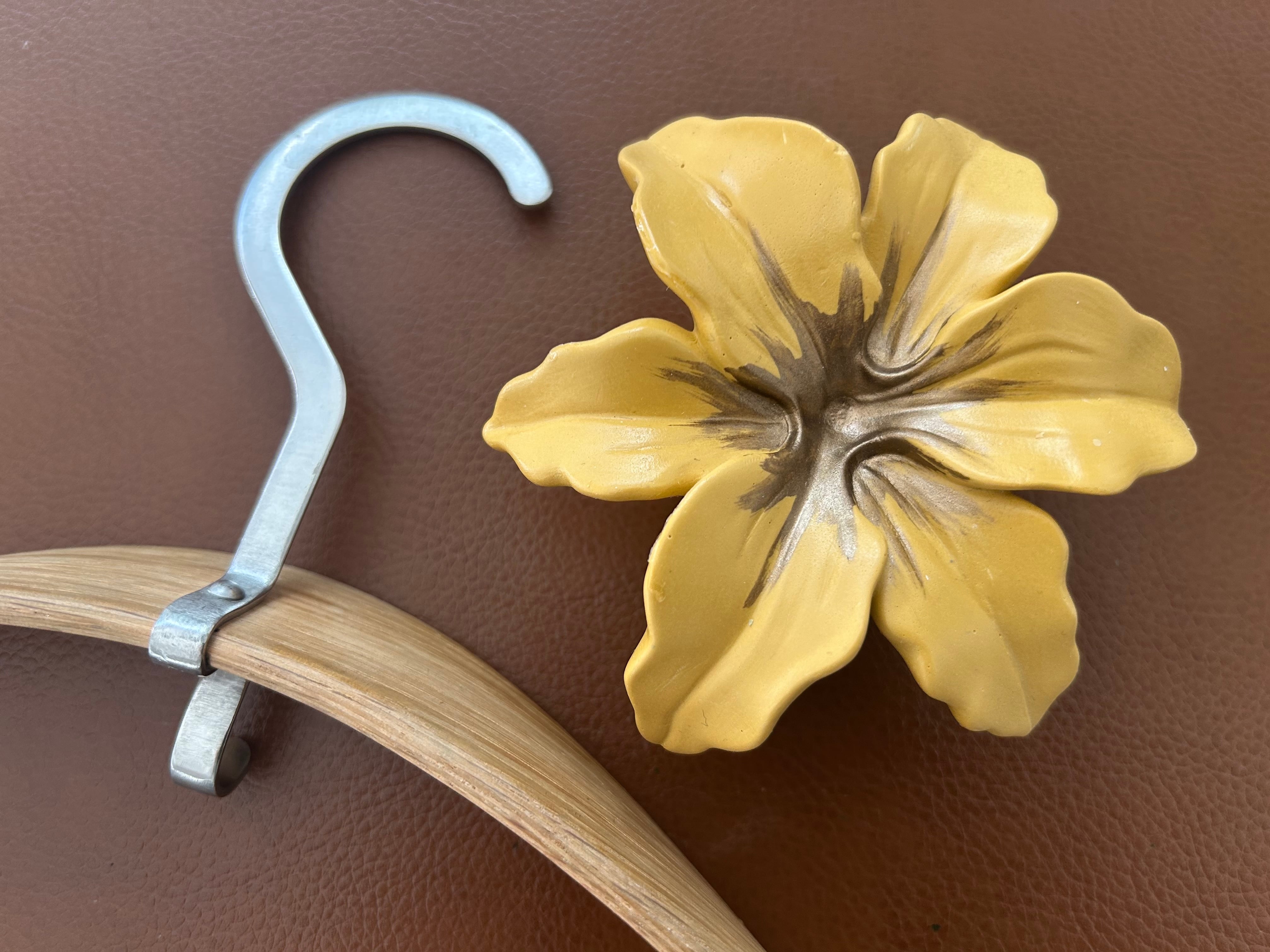En smuk, håndlavet knag af bæredygtigt jesmonite formet som blomsten af en lilje. Knagen er hvid med gul midte og overfladebehandlet med en skinnende, vandbaseret lak.