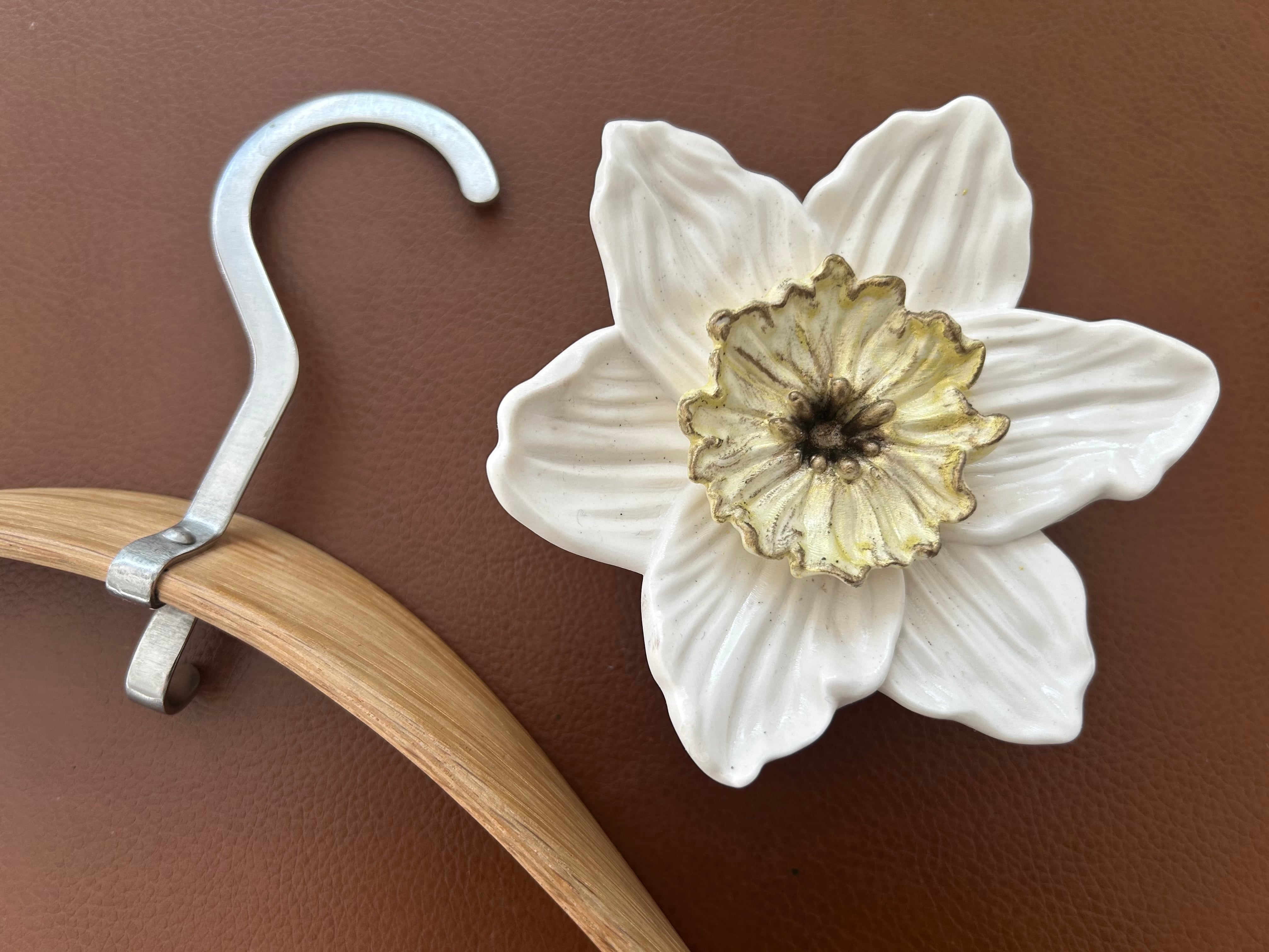 En dekorativ, håndlavet knag af bæredygtigt jesmonite formet som blomsten af en påskelilje. Knagen er hvid med gul midte og overfladebehandlet med en skinnende, vandbaseret lak.
