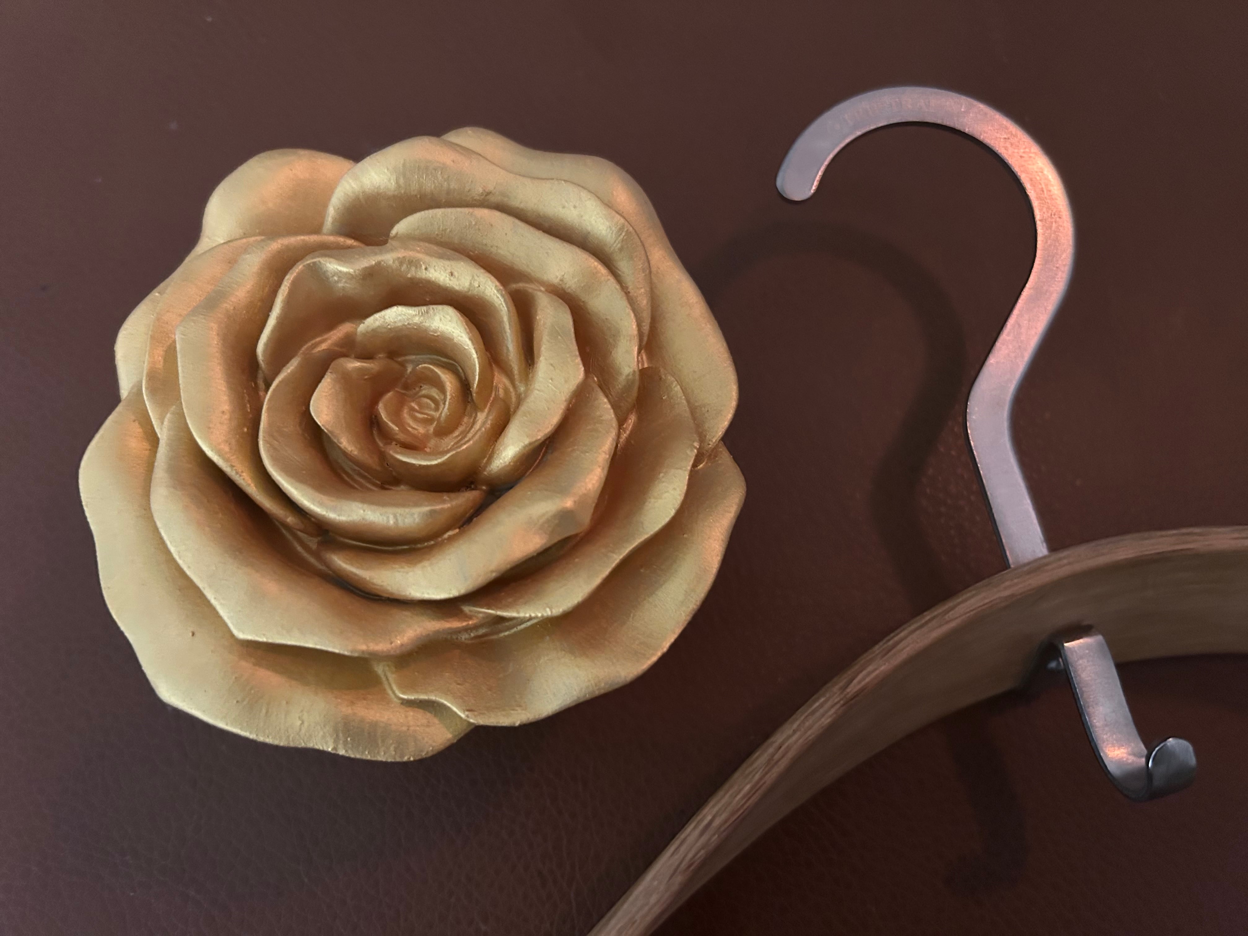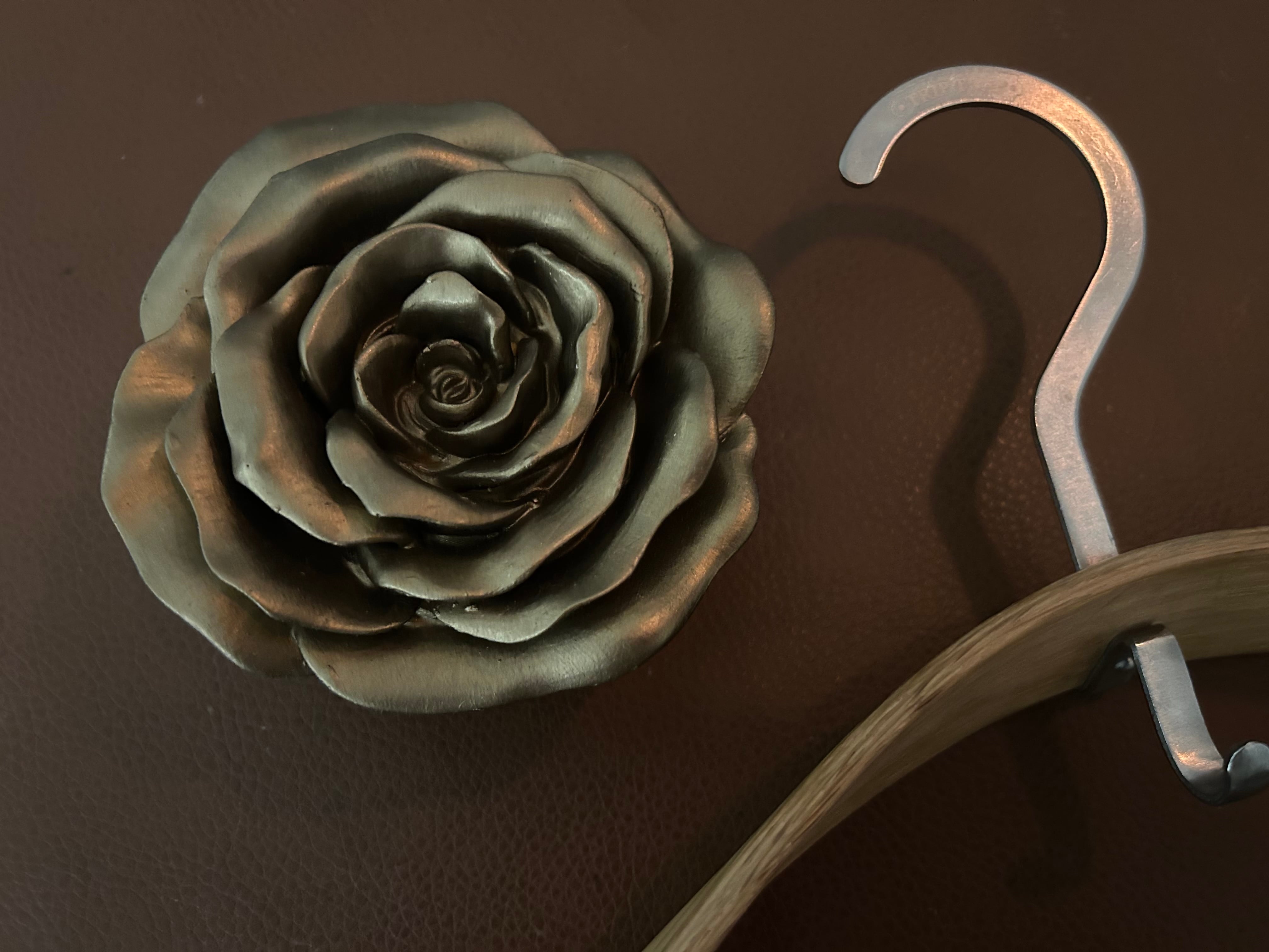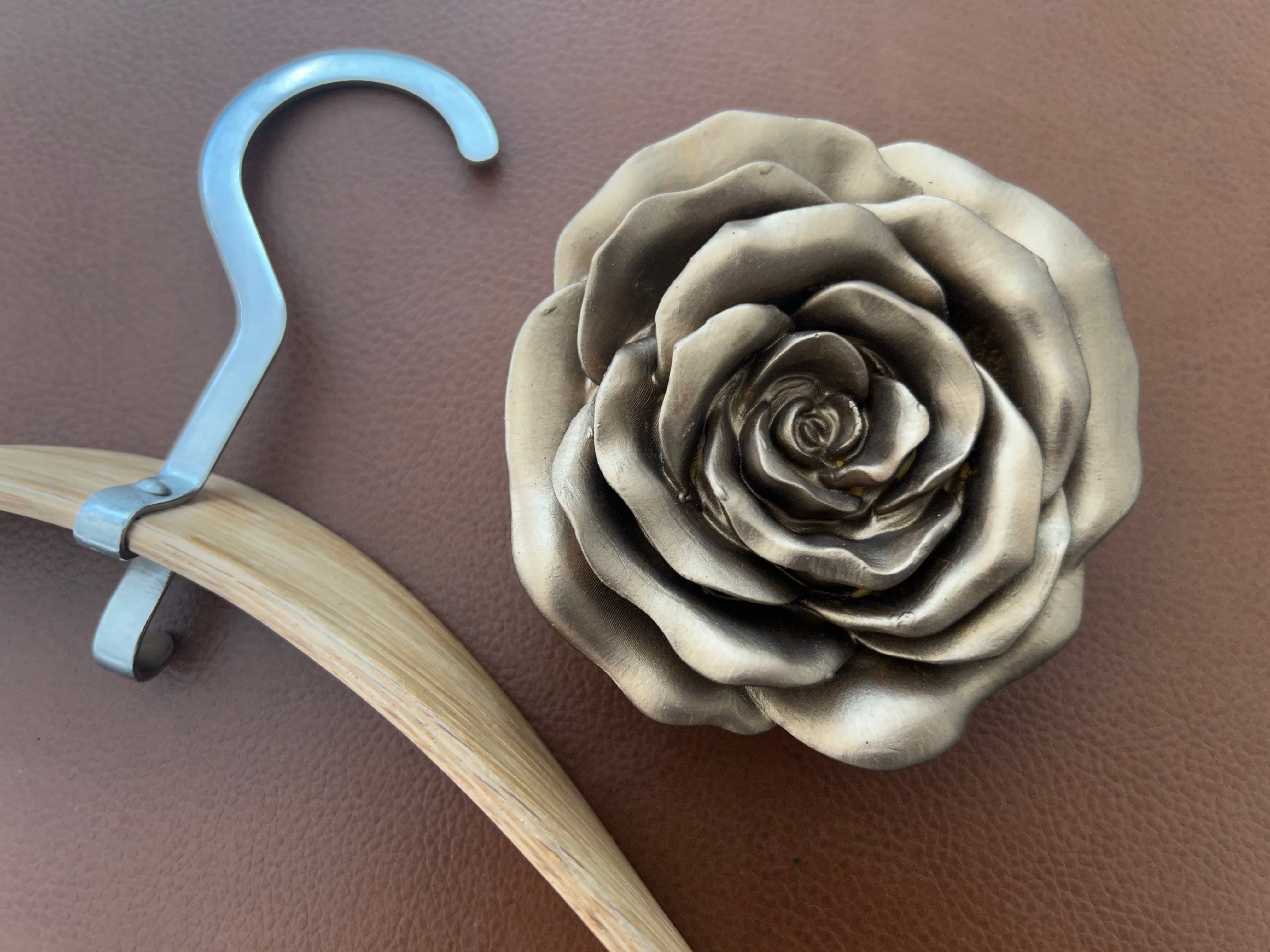 En flot, håndlavet knag af bæredygtigt jesmonite formet som blomsten af en rose. Knagen er overfladebehandlet med en skinnende, vandbaseret lak.