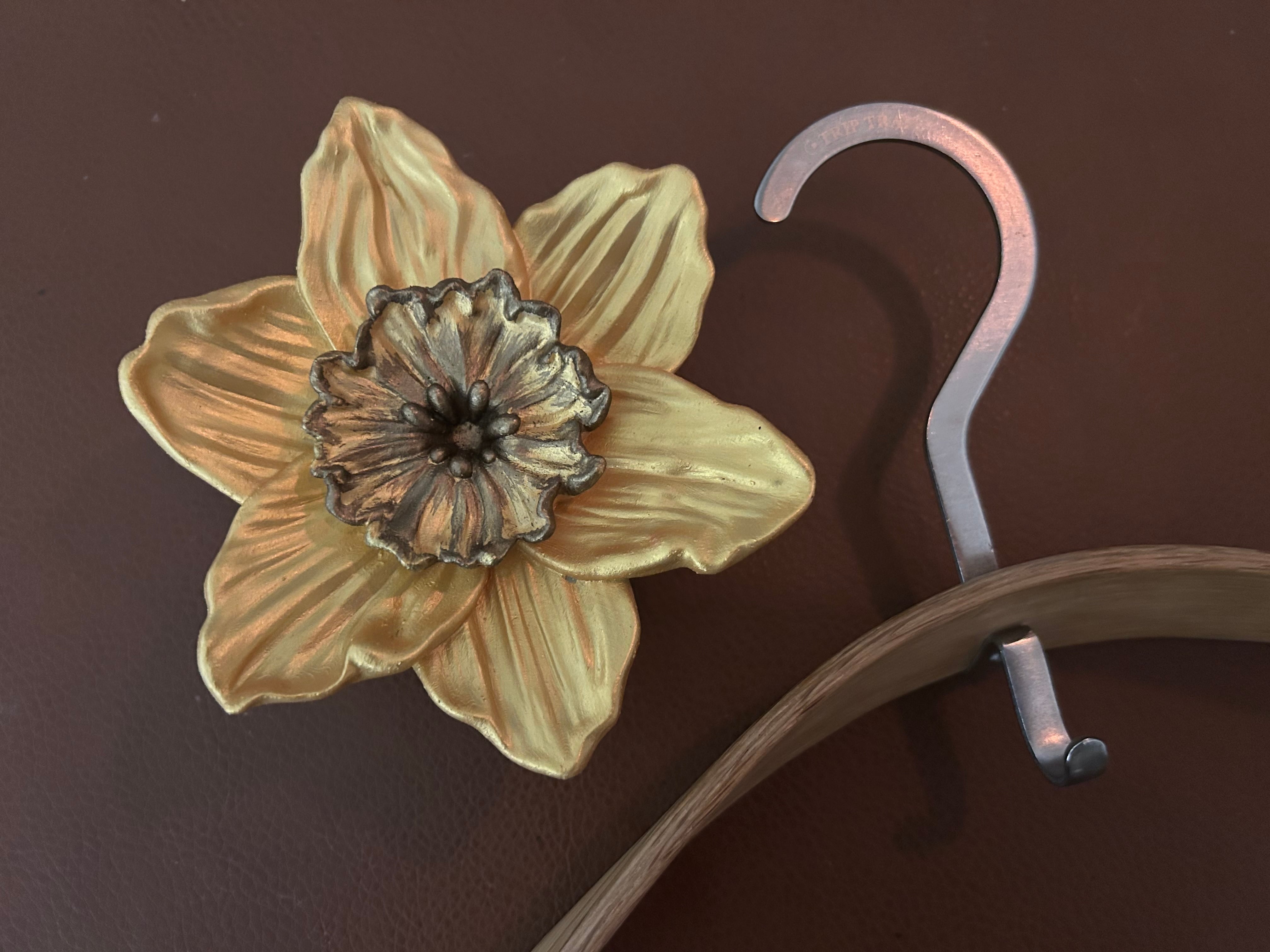 En dekorativ, håndlavet knag af bæredygtigt jesmonite formet som blomsten af en påskelilje. Knagen er beige med guld-farvet midte og overfladebehandlet med en skinnende, vandbaseret lak.
