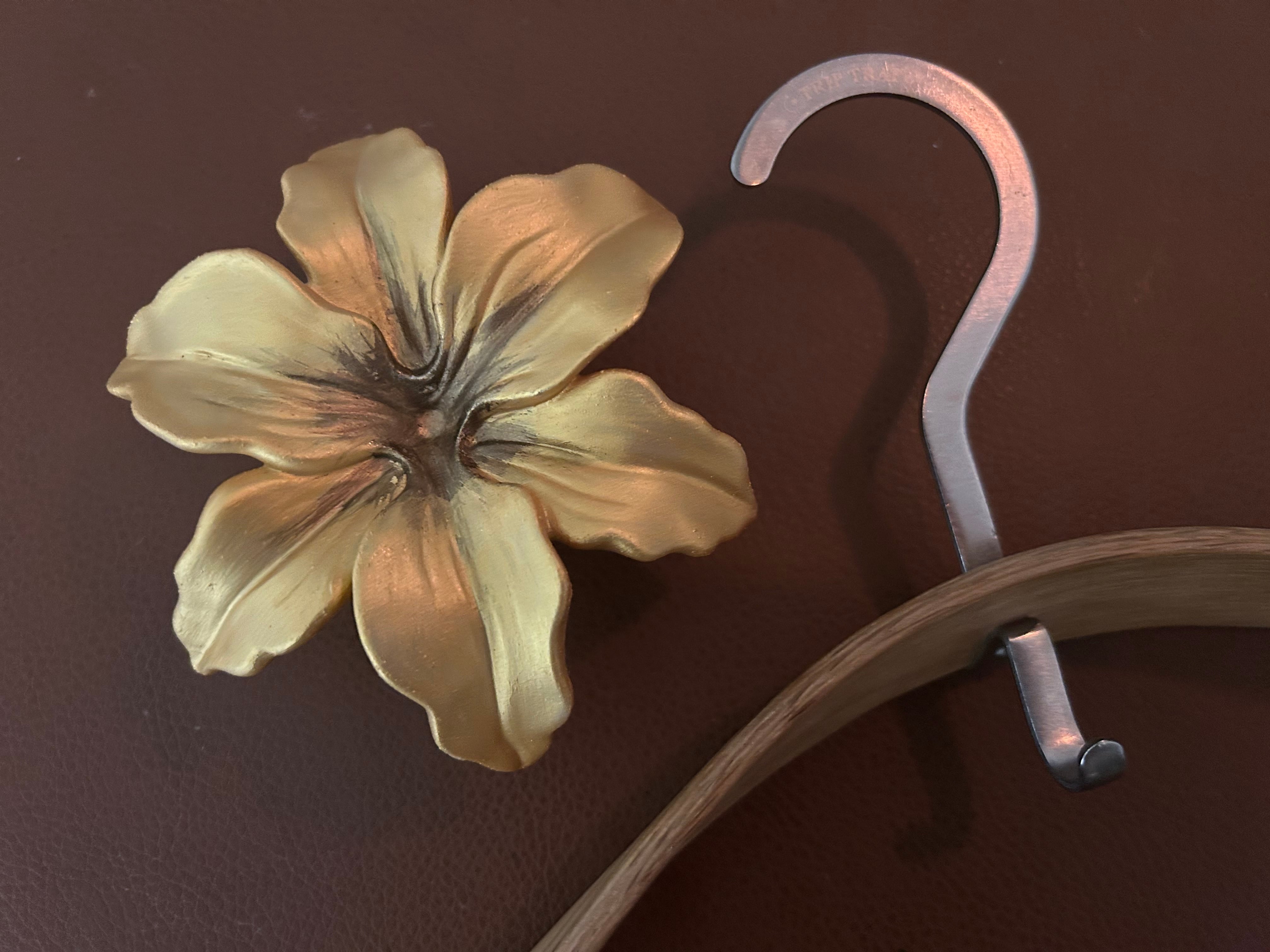 En håndlavet knag af bæredygtigt jesmonite formet som blomsten af en lilje.Knagen er beige med guld-farvet midte og overfladebehandlet med en skinnende, vandbaseret lak.