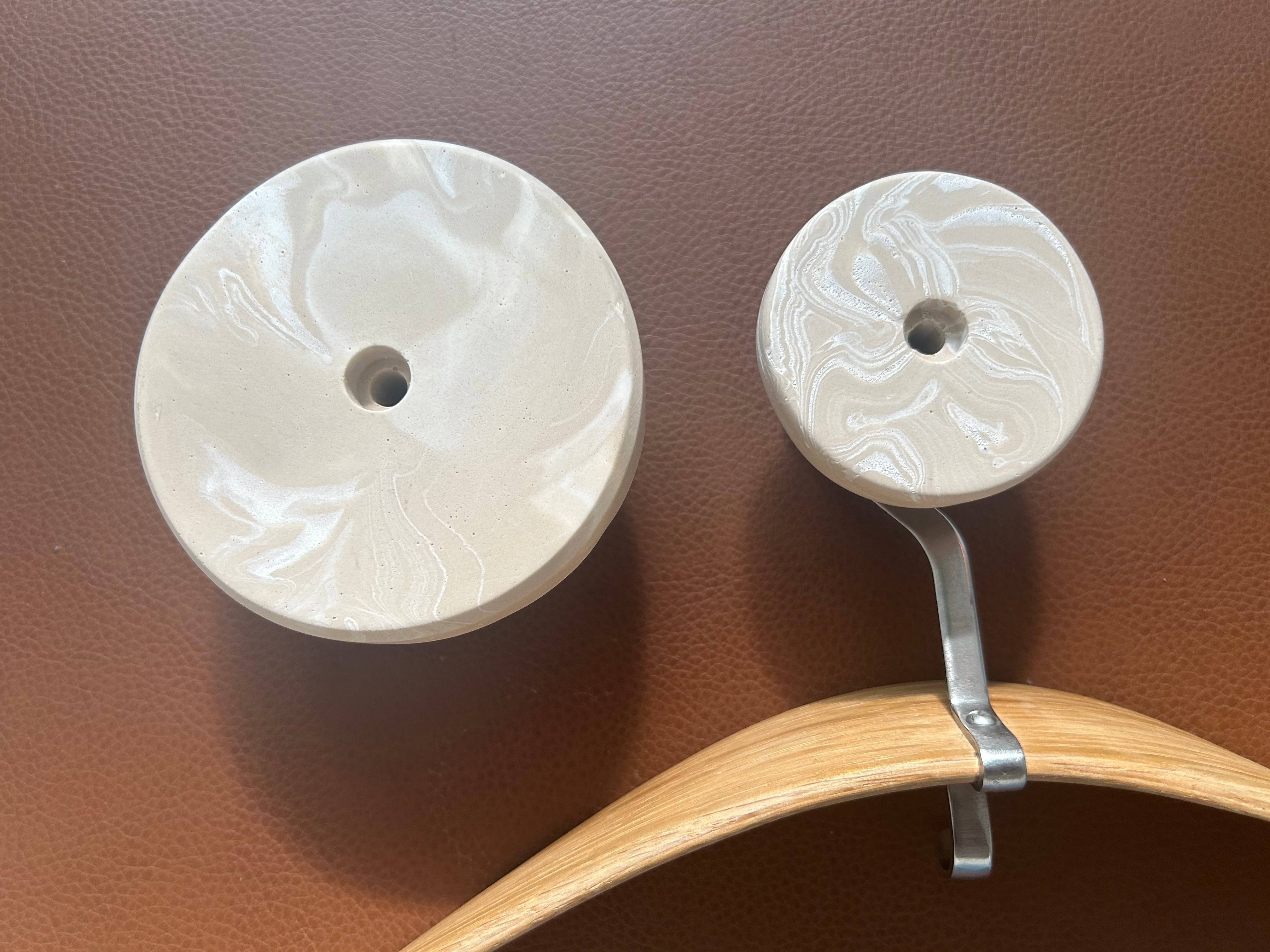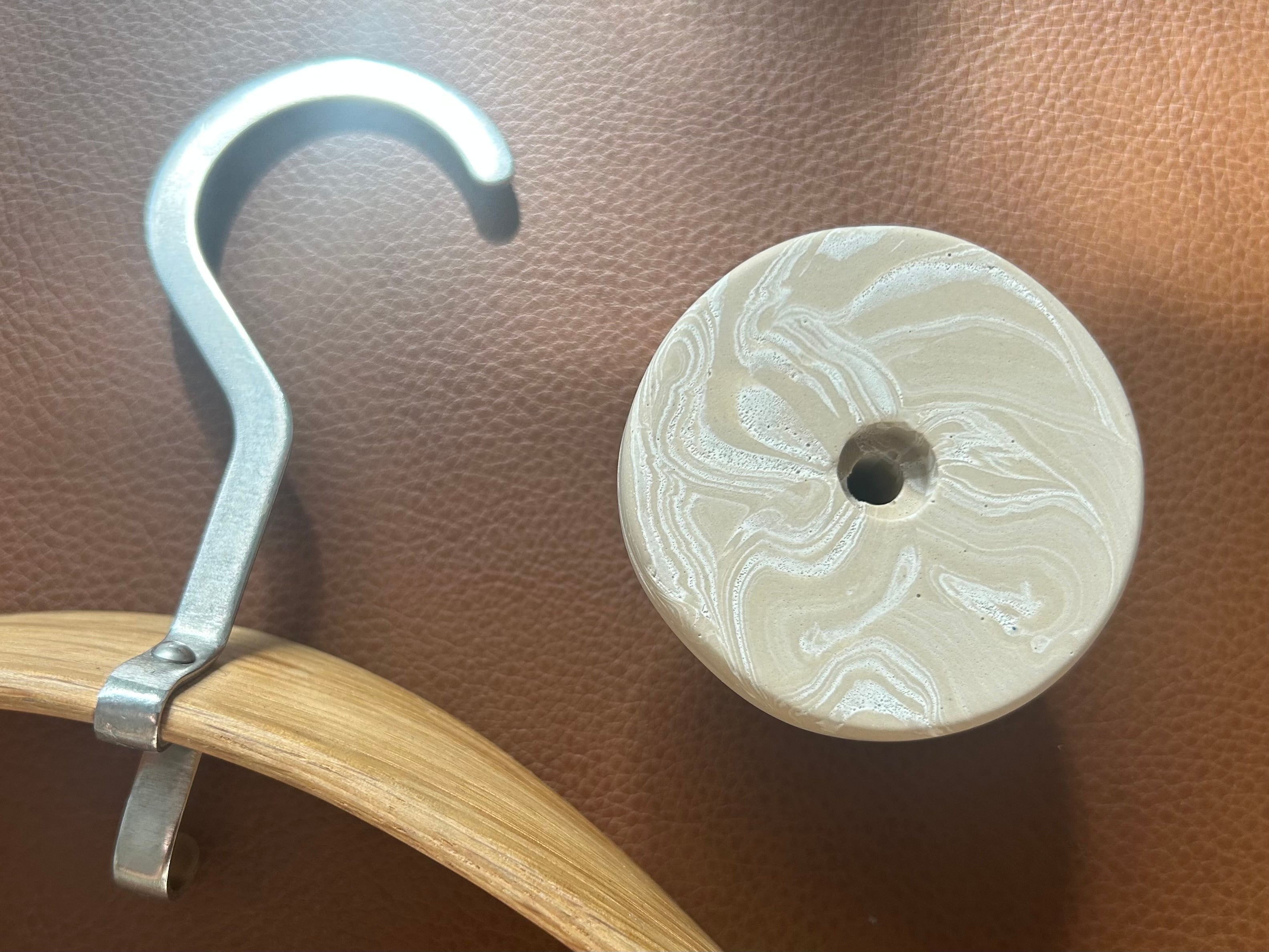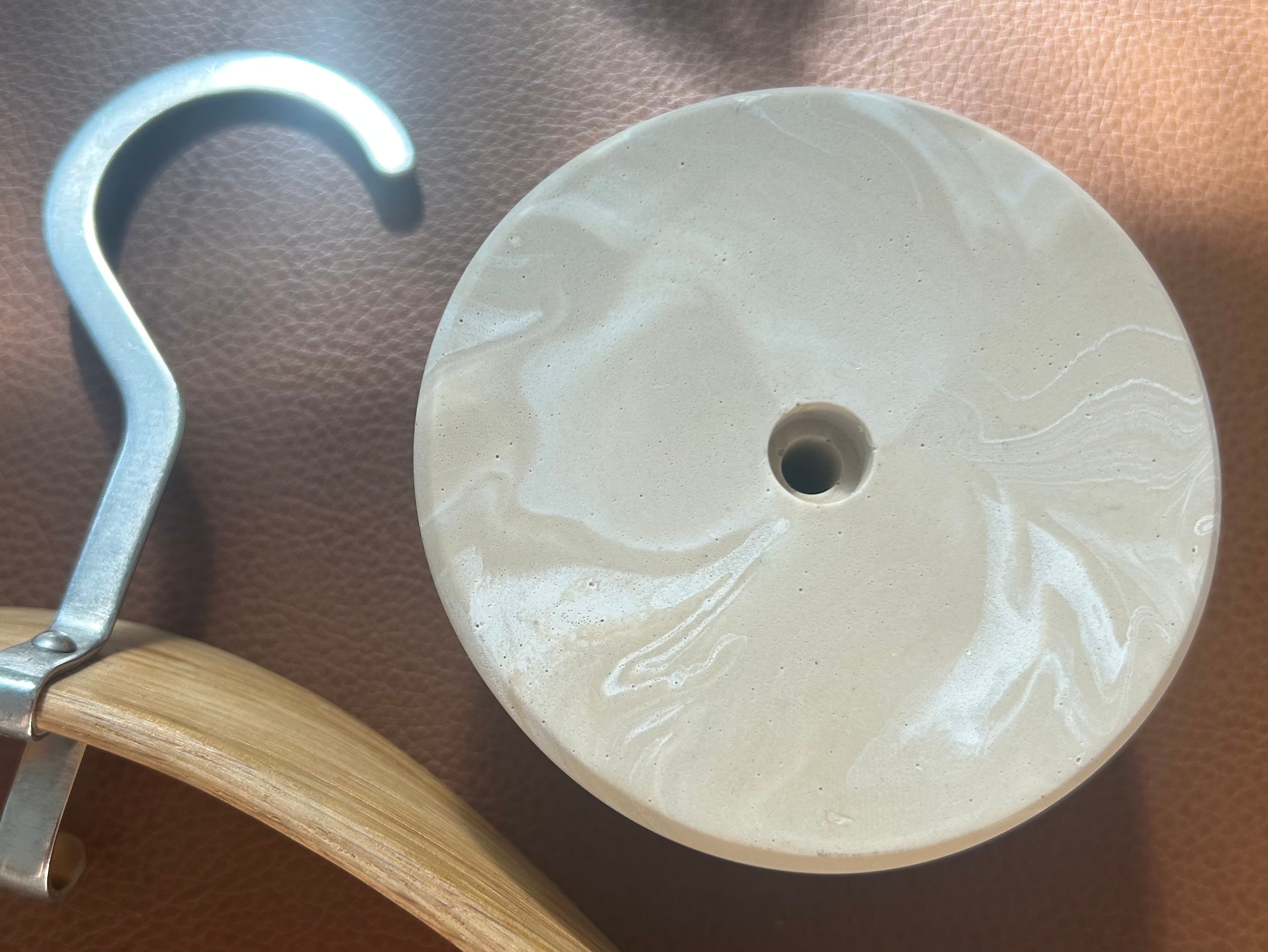 En stor, rund, håndlavet knag af bæredygtigt jesmonite. Knagen er overfladebehandlet med en skinnende, vandbaseret lak.